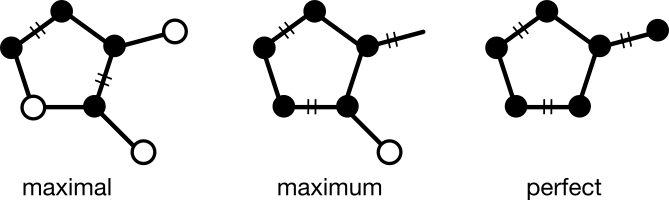 A perfect matching is also a matching in which all vertices are saturated (essentially, its number of edges is equal to \(|G| / 2\)). It can also be easily seen that a maximal matching is at least half the size of a maximum matching.